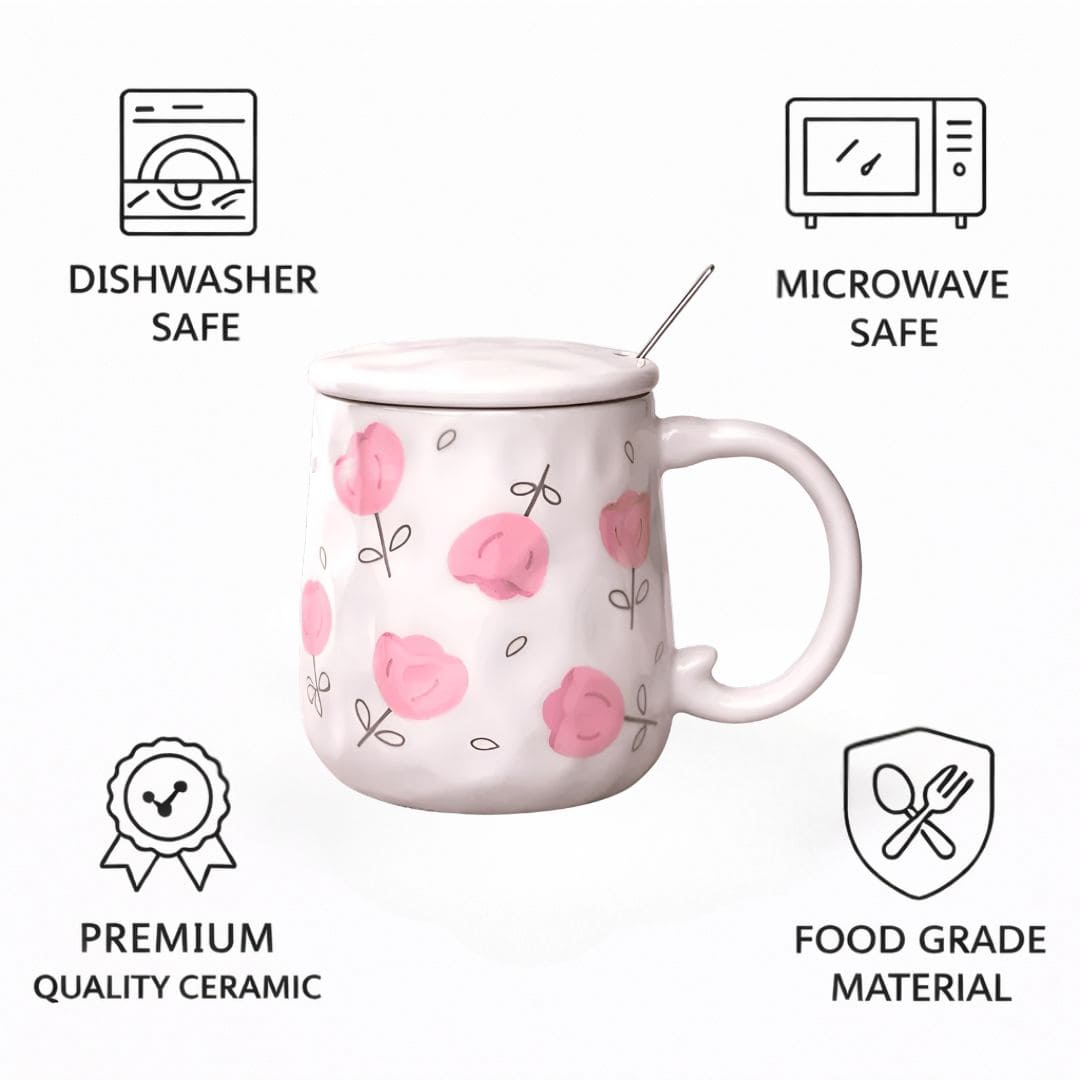 Blush Bloom Ceramic Mug - a calm, cozy floral mug that brightens everyday sips. Hand-finished ceramic with soft blush blossoms and a gently tapered silhouette, it feels premium in hand and looks beautiful on bedside tables, work desks, and coffee corners. The smooth glaze and rounded, easy-grip handle make it your go-to for morning brews, evening chai, or late-night cocoa. Includes a matching lid and spoon for heat retention and a tidy, café-style experience.