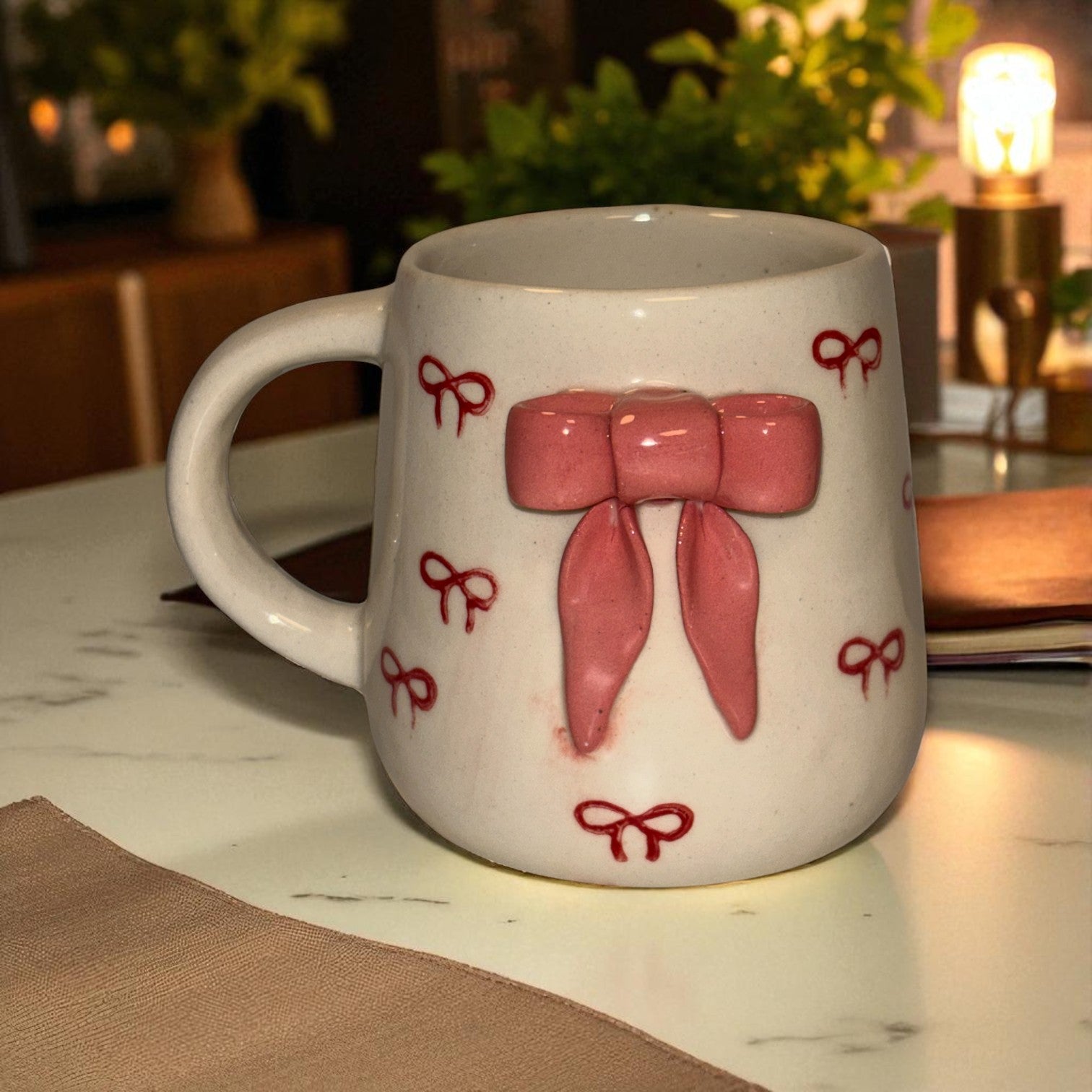 Wrap your daily ritual with a little gift-like joy. The Cozy Bow Ceramic Cup features a blush bow motif scattered across a warm ivory base, finished with a silky satin glaze for a calm, premium look. Each cup is shaped and hand-painted by Indian artisans, so subtle variations make yours one of a kind.