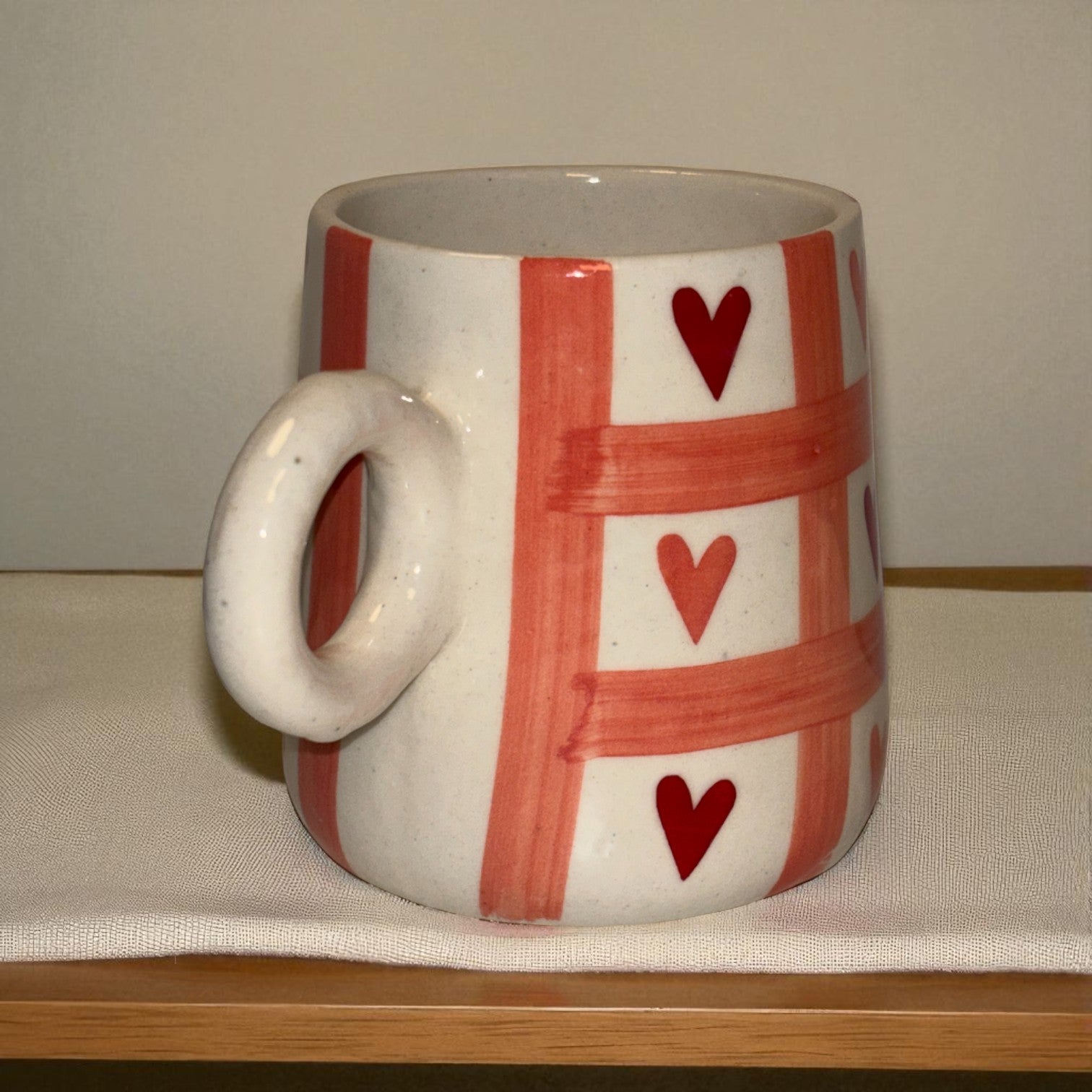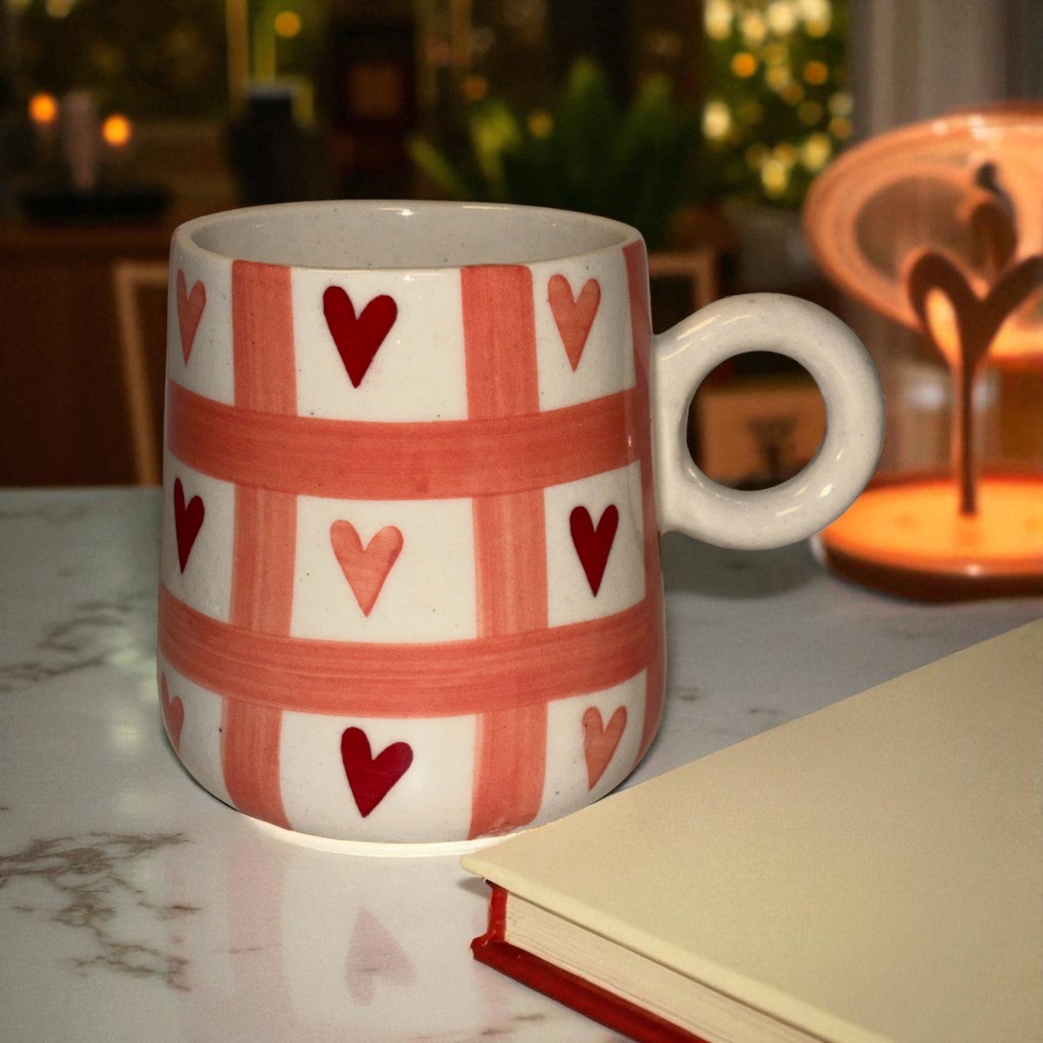 Bring a little love to your daily ritual with the Heart Lattice Ceramic Cup - a warm ivory cup hand-painted with a coral grid and tiny hearts. The softly tapered body and round ring handle feel comforting in your palm, while the satin glaze gives a premium, easy-clean finish. Each piece is crafted and painted by Indian artisans, so subtle variations make your cup uniquely yours.
