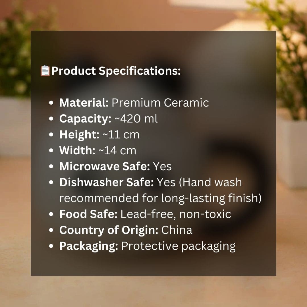 Crafted from high-grade ceramic, it keeps your beverages at the perfect temperature - whether it’s your first morning pour or a midnight matcha. The glossy black handle adds contrast and comfort, while the panda lid keeps your drink warm and your vibe cuter than ever.