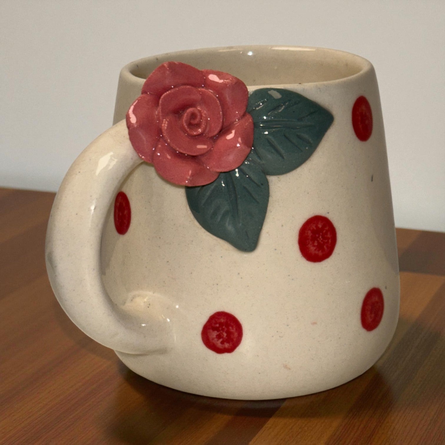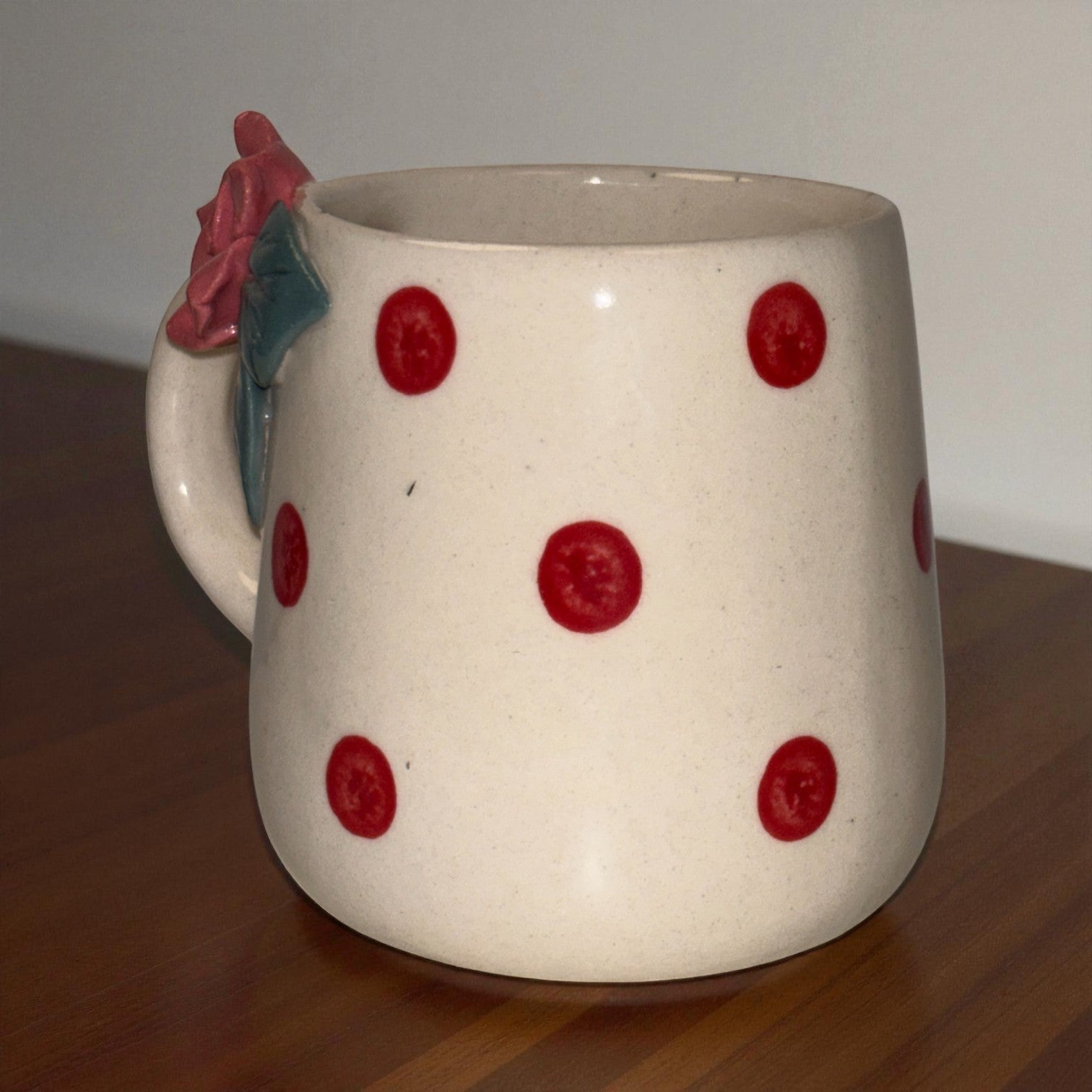 Playful yet elegant, the Polka Rose Ceramic Cup sprinkles joy into every sip. A creamy base with hand-painted red polka dots meets a sculpted rose and leaf at the handle-finished in a smooth satin glaze that feels calm and premium in hand. Each cup is shaped and painted by Indian artisans, so yours carries subtle variations and a one-of-a-kind charm.