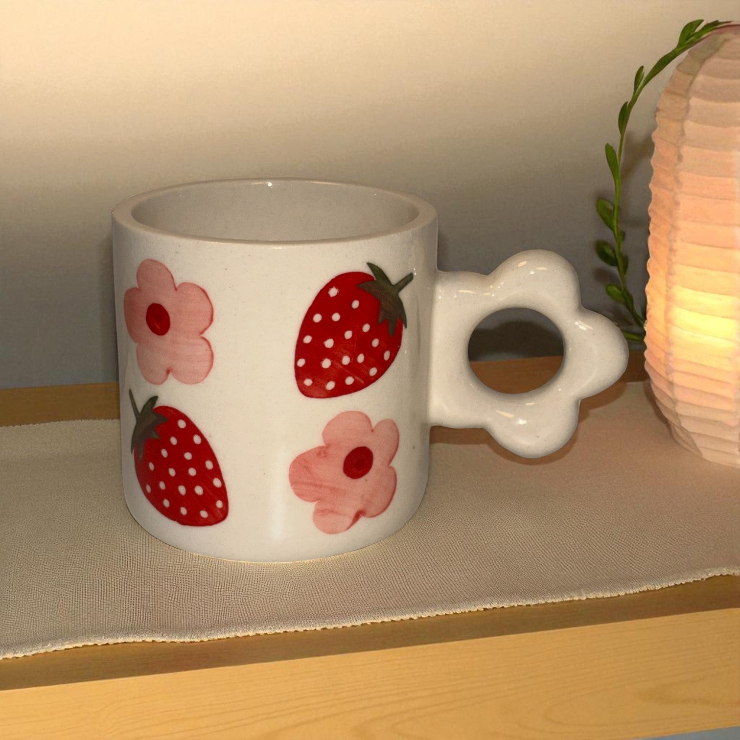 Sweet and serene. The Strawberry Bloom Ceramic Cup pairs hand-painted strawberries and soft blossoms on a warm ivory base with our smooth satin glaze for a calm, premium look. Shaped and finished by Indian artisans, each cup has gentle variations that make it uniquely yours.